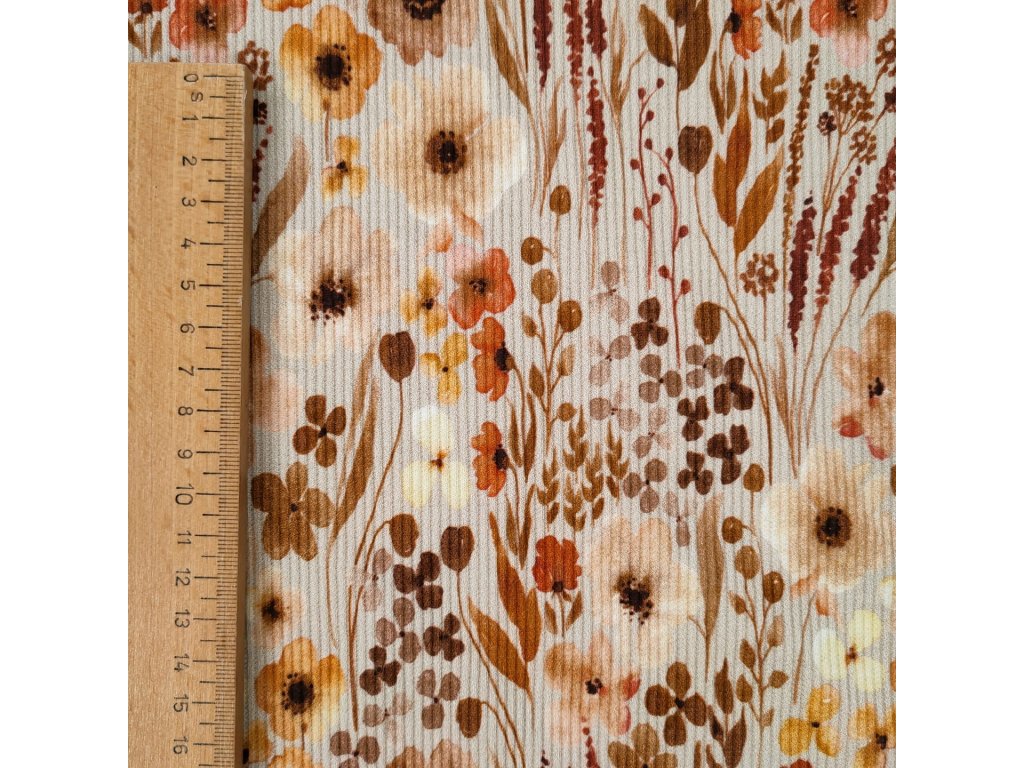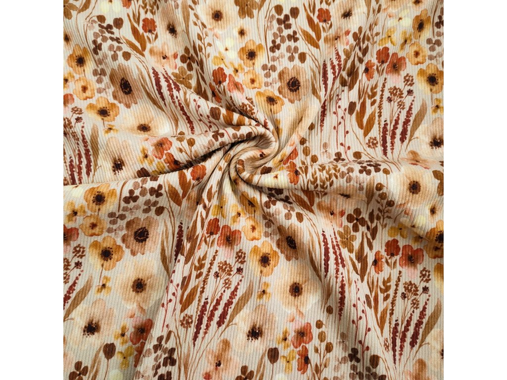 Bavlněný žebrovaný úplet květy na béžové (1 m)